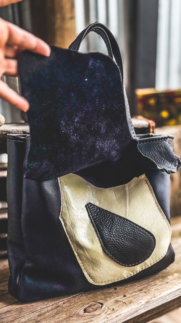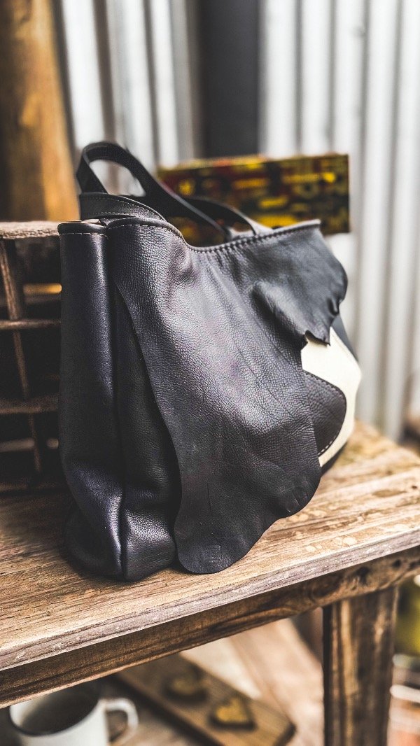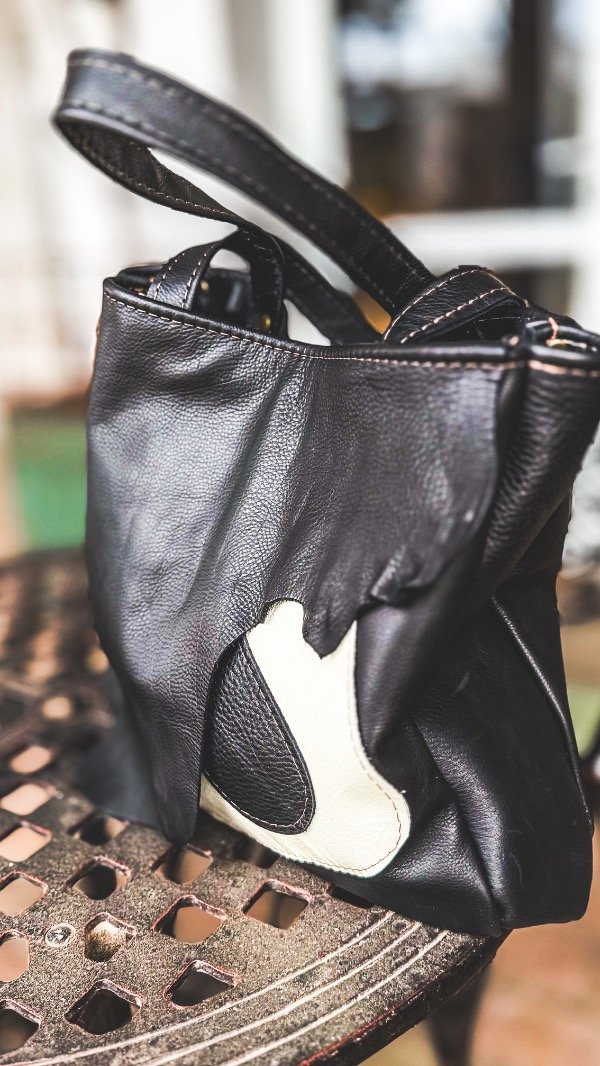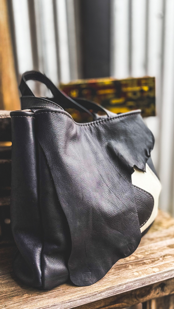 Cartera de cuero en cuero negro graneado, con parches al frente en color blanco y negro, que además es bolsillo. Amplia falda en el mismo cuero de la cartera cae sobre el frente.