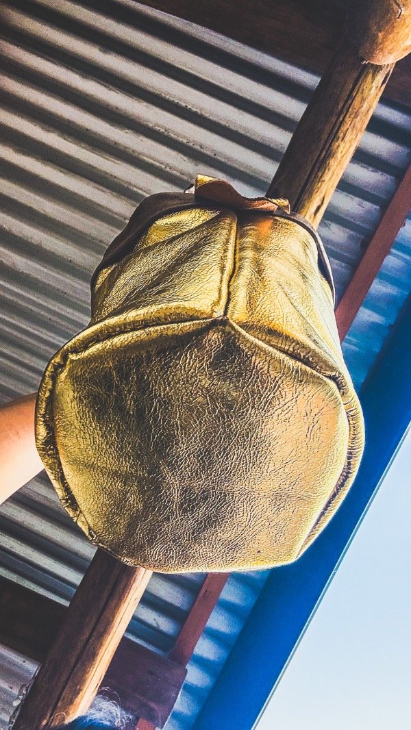 Cartera de cuero, base redonda, en color dorado quebrado, con detalle en cuero suela gastado.